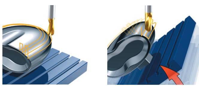 如上图,在左图中三轴切削方式,当切削刀具向顶端或工件边缘移动时,切削状态逐渐变差。而要在此处也保持最佳切削状态,就需要旋转工作台。而如果我们要完整加工一个不规则平面,就必须将工作台以不同方向旋转多次。可以看见,五轴机床还可以避免球头铣刀中心点线速度为0的情况,获得更好的表面质量。