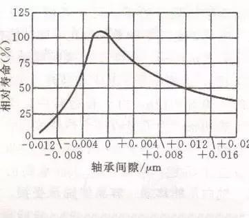 滚动轴承间隙与预紧滚动轴承存在较大间隙时,载荷将集中作用于受力方向上的少数滚动体上,使得轴承刚度下降,承载能力下降,受力低,旋转精度差。微信jx-gscom 机械公社圈 将滚动轴承进行适当预紧,使滚动体与内外圈滚道在接触处产生预变形,受载后承载的滚动体数量增多,受力趋向均匀,提高了承载能力和刚度,有利于减少主轴回转轴线的漂移,提高了旋转精度。若过盈量太大,轴承的摩擦磨损加剧,使受力将显著下降,轴承寿命与间隙之间的关系如下图所示。