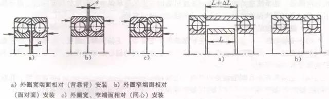 角接触球轴承间隙调整和预紧的方法如图所示。成对使用的角接触球做成是将轴承内圈端面或外圈端面磨去后实现。轴承生产厂家按要求的预紧量成对提供,装配时不需要再调整,用螺母将其并紧后即可获得精确的预紧力。由于使用中不能调整,维修比较麻烦。