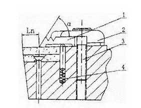 在车刀前刀面上装一个挡屑板1,切屑沿刀具的前面流出时,因受挡屑板1所阻而弯曲折断。断屑器的参数Ln和α可按需要设计和调整,以保证在给定的切削条件下,断屑稳定可靠。松开螺钉3, 在弹簧4的作用下,可使挡屑板1和压板2一起抬起,便于挡屑板调整和刀片的快速转位与更换。这种断屑器常用于大、中型机床的刀具上。