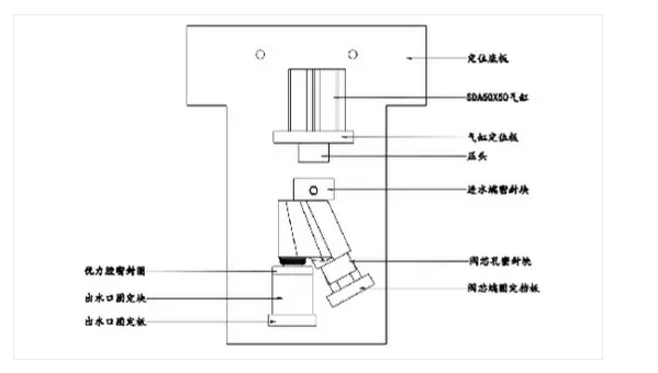 1、上图是试气工装的参考图,具体结构需依据产品的实际结构来设计,思路就是用尽可能简单的方式密封产品,让需检测密封的部分充满气体来确认其密封性;