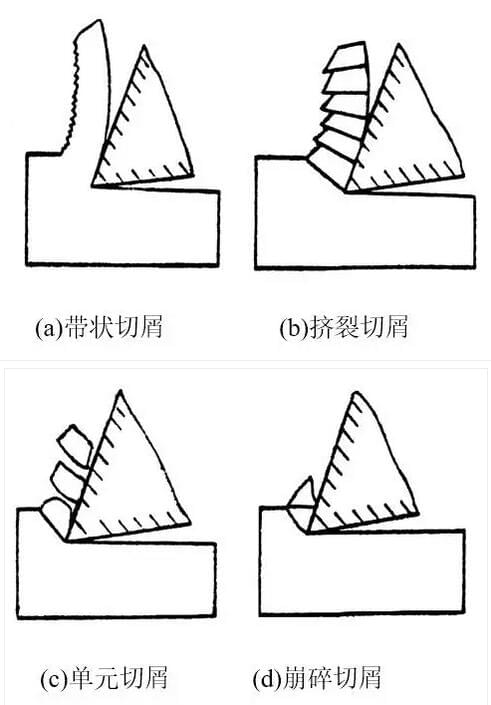加工中心产生切屑不可避免,由于工件材料不同,切削条件各异.切削过程中生成的切屑形状是多种多样的。切屑的形状主要分为带状、节状、粒状和崩碎四种类型,如下图所示。