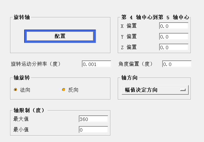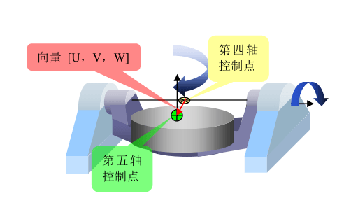 数控系统为了实现五轴控制,需要知道第5轴控制点与第四轴控制点之间的关系。即初始状态(机床A、C轴0位置),第四轴控制点为原点的第四轴旋转坐标系下,第五轴控制点的位置向量[U,V,W]。同时还需要知道A、C轴轴线之间的距离。对于双转台机床,举例如下图所示。
