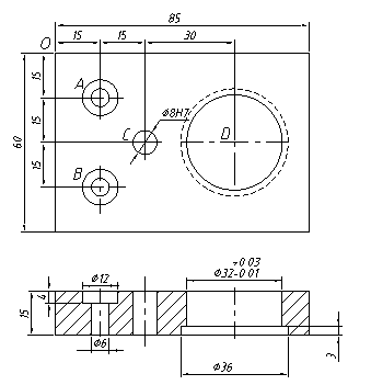 如图所示的零件,其上共有4个孔,两个精度要求不高的φ6/φ12的沉头孔,可以直接钻头钻穿,后采用φ12的立铣刀扩出沉孔。φ8H7的通孔要求精度较高,可以先采用φ7.8的钻头先钻穿,留0.2mm的余量进行铰削加工,保证精度。φ36的沉孔为了保证孔的同轴度和表面的垂直度可以采用背镗工艺,因此该零件安排的加工工艺过程如下: