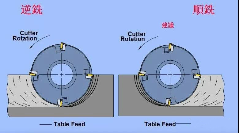 逆铣要把工件完全夹紧,否则会有提起工作台的危险。逆铣的切屑厚度为0,在切削过程中切屑的厚度逐步增大到最大值。逆洗会造成刀具挤刀,弹刀的副作用,后刀面磨损加快也会降低刀片的耐用度。在加工高钢合金的过程中易产生表面硬化和表面质量不理想的状况。